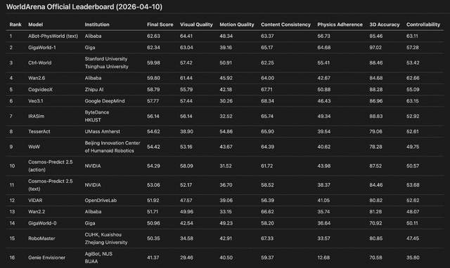 今年四月初,阿里推出的HappyHorse模型就在Artificial Analysis榜单上拔得头筹。这次新上线的ABot-PhysWorld同样超越了GigaWorld和Google Veo等知名模型,在世界模型领域权威评测中胜出。