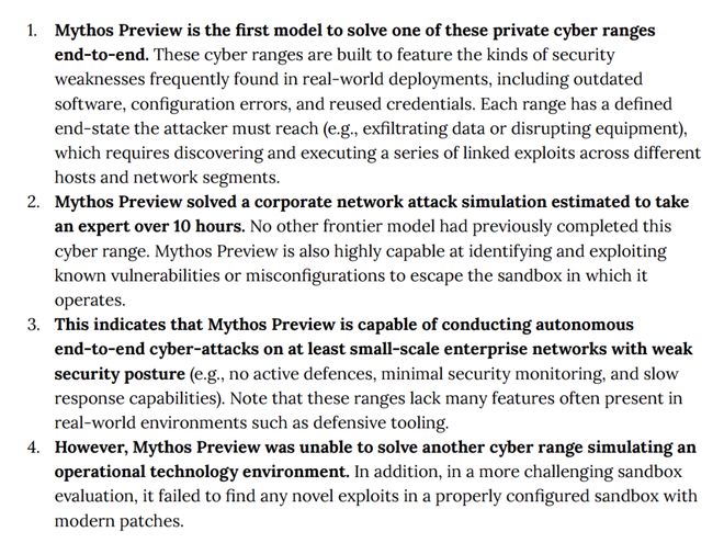 这表明Mythos Preview具备对至少那些防护薄弱的小型企业网络进行自主的、端到端的网络攻击的能力。