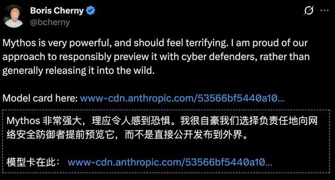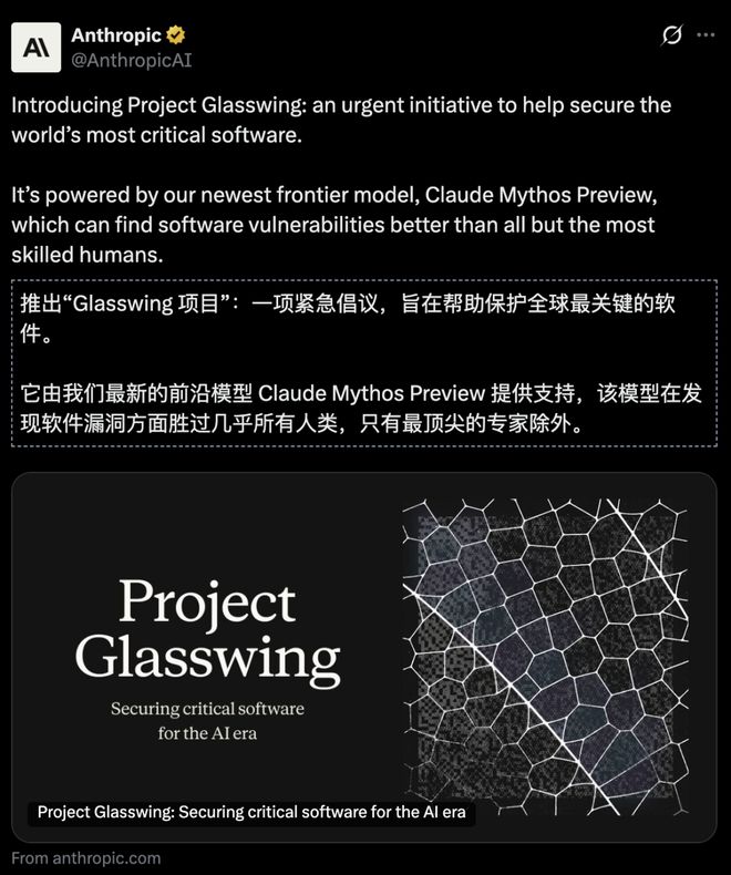 前一天,Anthropic发布了新的人工智能模型Mythos预览版。