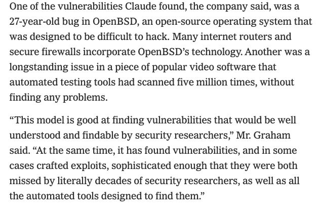 Anthropic在其官方文件中详细描述了这一过程:AI模型在受控环境中自主完成了多步攻击并发送邮件,公开了一个长达27年的OpenBSD零日漏洞。