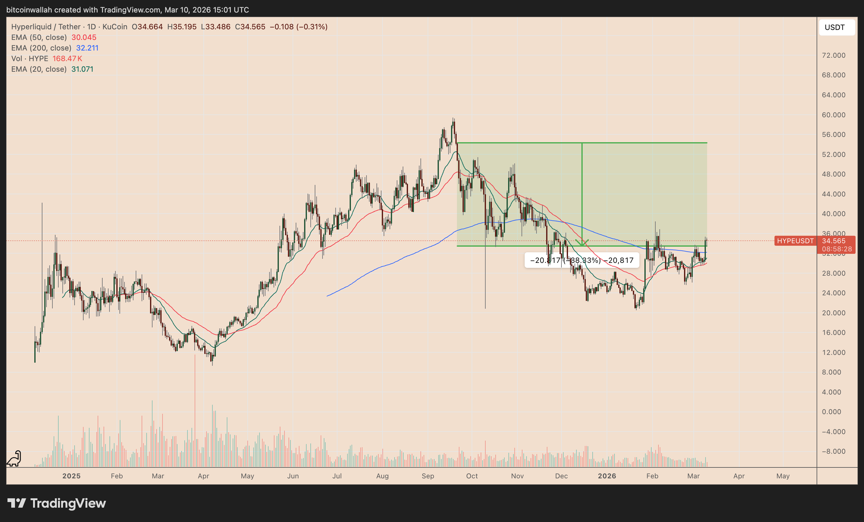 如果HYPE能够坚定地越过35.5美元这条关键支撑线,按照技术规则计算,它有望达到约50美元的目标价。这一走势若成真,将使当前的价格上涨超过40%。