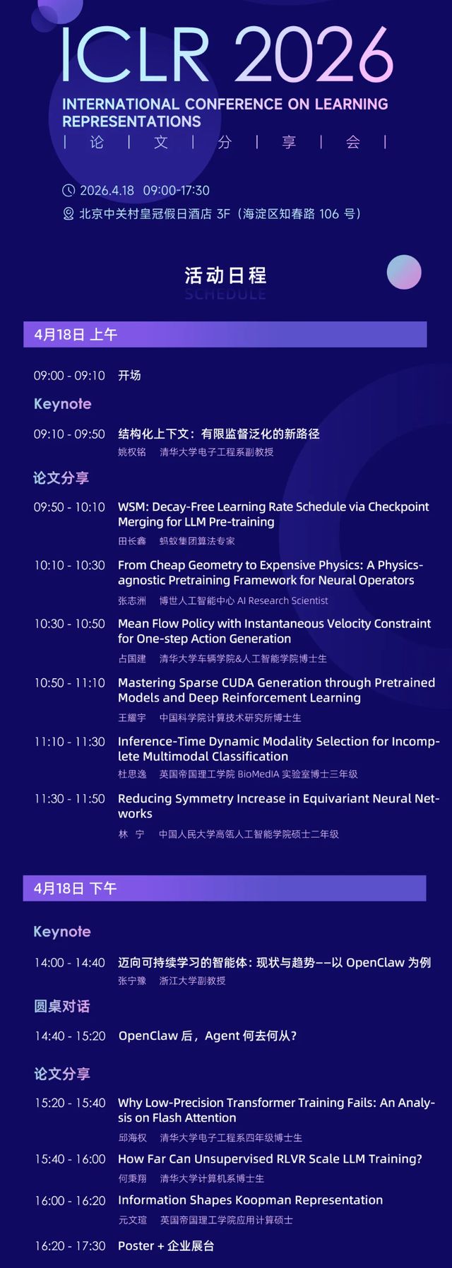 为了使国内的研究人员和从业者能够第一时间深入了解这些前沿成果,机器之心计划于2026年4月18日在北京举办 ICLR 2026 论文分享会。