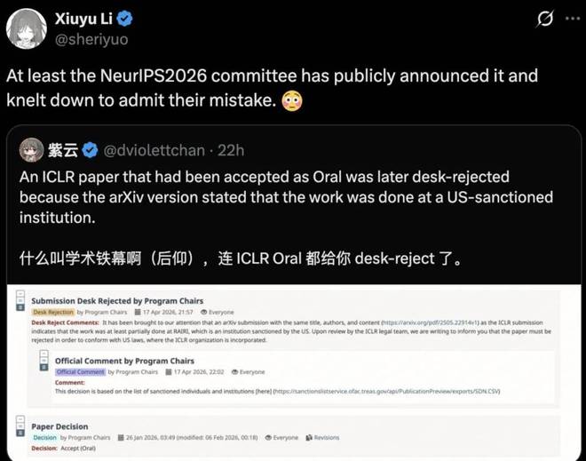 对比之下,有评论指出 NeurIPS 在面临相似的制裁政策时曾公开致歉并调整了立场。