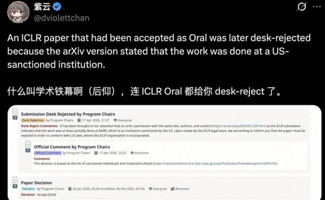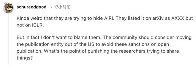 「但事实上,我并不想责怪他们。想说的是,ICLR 应该考虑将出版实体移出美国,以避免这些对开放出版的制裁。毕竟,惩罚那些试图分享知识的研究人员有什么意义呢?」