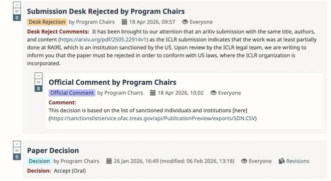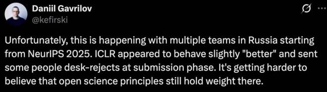 近年来,由于美国政府对某些机构施加制裁措施,多家国际会议都遇到了类似的问题。据称自 NeurIPS 2025 起,俄罗斯团队已多次遭遇此类情况。