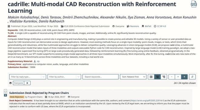 这里有必要提一嘴,论文作者在提交阶段通常遵循「双盲原则」,不会披露机构,因而不存在「故意隐瞒」,但在录用后的 Final Camera-ready 阶段或 arXiv 预印本中,作者必须列出附属机构。ICLR Program Chairs 正是在此时识别到了 RAIRI 这一实体。