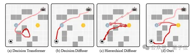 - 决策扩散算法则因为生成过程中的局部偏差问题,虽然智能体能够到达目的地,但未能收集所有金币,整体连贯性较差。