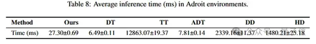 MAGE在保持高性能的同时,实现了卓越的计算效率。实验结果显示,其运行速度快于Hierarchical Diffuser约50倍,比Decision Diffuser快80倍,每步推理时间控制在27毫秒内,完全满足了真实机器人实时操作的需求。