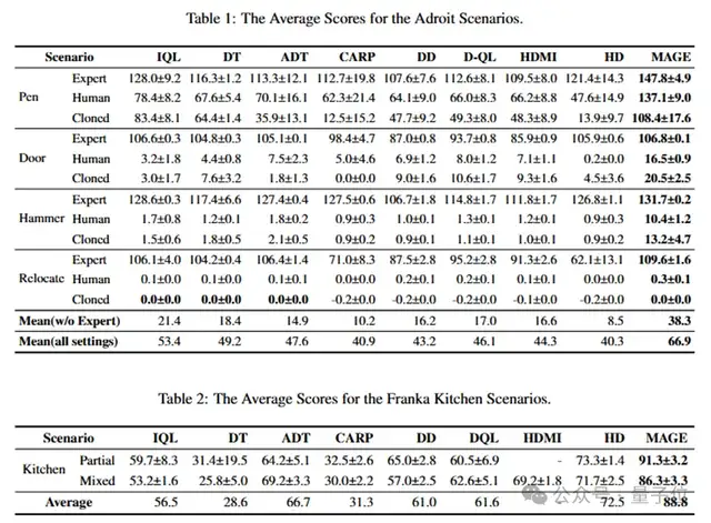 研究团队将MAGE与15种代表性基线算法进行了广泛的对比测试,涵盖了Adroit、Franka Kitchen等五个离线RL基准数据集。