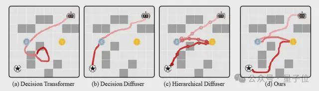 - Decision Diffuser则因为扩散模型固有的局部生成偏差,虽然智能体最终到达了目的地,但路径规划中遗漏了一枚重要的金币,全局连贯性较差。