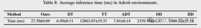 MAGE不仅保持了高性能的表现,还实现了高效的计算资源利用。实验结果显示,相比Hierarchical Diffuser,其运行速度快约50倍;而与Decision Diffuser相比,则快80倍。每步推理时间控制在27毫秒以内,完全满足真实机器人控制系统所需的实时要求。
