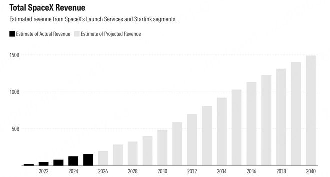 SpaceX的主要收入来源是星链(Starlink)卫星互联网业务。据美国投资研究机构晨星(Morningstar)的估算,Starlink在2025年的营收约为106亿美元(约合人民币730亿元),税息折旧及摊销前利润(EBITDA)为58亿美元(约合人民币400亿元),利润率高达54%,占SpaceX总营收的约67%。Starlink的用户数量在过去两年中持续翻倍增长,从2023年底的230万增加到2024年底的460万,再到2025年底的920万。总的来说,SpaceX在2025年的总营收预计在150亿至160亿美元之间(约合人民币1034-1102亿元),EBITDA约为75亿至80亿美元(约合人民币517-551亿元)。