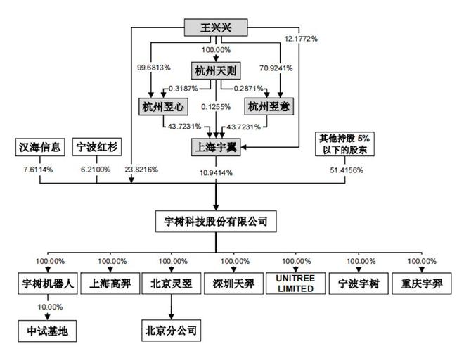 宇树科技控股股东及实际控制人为王兴兴。截至招股说明书签署日,王兴兴直接持有公司23.8216%的股份,在表决权差异安排下,其直接持股对应表决权比例为63.5457%,加上通过员工持股平台上海宇翼持有的股份,合计控制公司表决权比例为68.7816%。