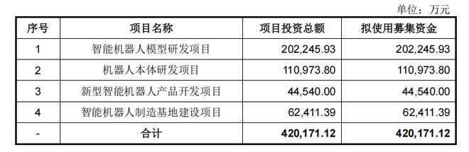 根据招股书,所募资金将全部用于四个核心项目的建设:智能机器人模型研发项目、机器人本体研发项目、新型智能机器人产品开发项目以及智能机器人制造基地建设项目。