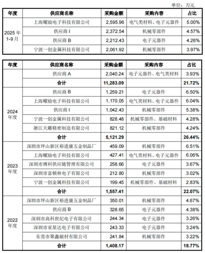 宇树科技的主要原材料包括机械零部件、电子元器件及电气类材料,向前五大供应商的采购额占总采购额的比例分别为18.77%、22.07%、26.44%和21.72%。