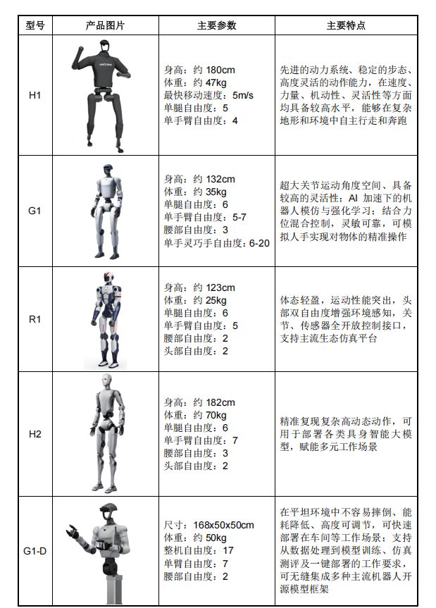 宇树科技主要专注于四足机器人、人形机器人、机器人核心组件及具身智能模型的研发,构建了一套完整的“移动+操作+交互”产品体系。