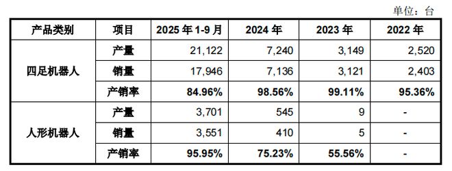 从产品类别来看,宇树科技各类产品的产量、销量及产销率情况如下:四足机器人方面,从2022年到2025年1-9月,宇树科技的产量分别为2520台、3149台、7240台和21122台,销量分别为2403台、3121台、7136台和17946台,产销率分别为95.36%、99.11%、98.56%和84.96%。
