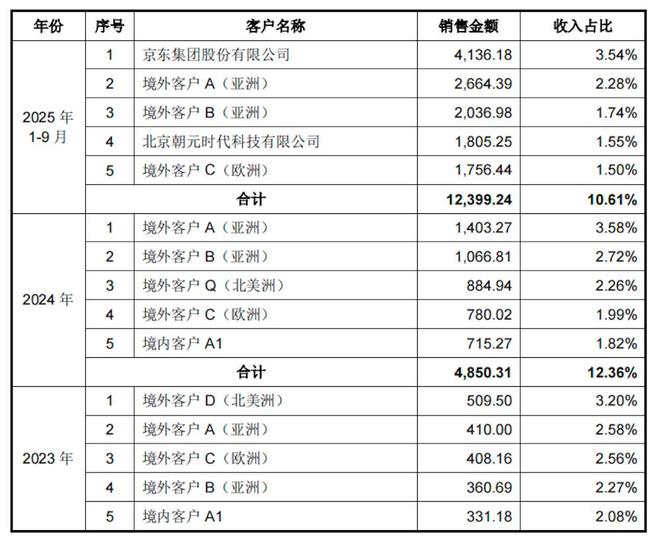2022年至2025年1-9月,宇树科技前五大客户销售收入占营业收入的比例相对较低。以2025年1-9月为例,前五大客户销售收入合计占比为10.61%,其中京东集团占比为3.54%。