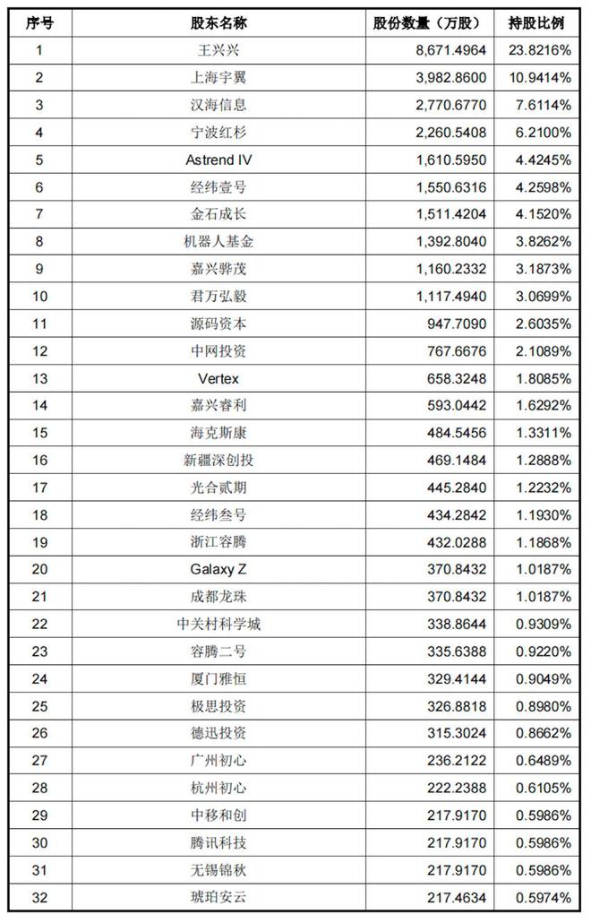 宇树科技的股东阵容包括美团、红杉中国、经纬创投、顺为资本、腾讯科技、中移合创、海克斯康、机器人基金、中网投资和Vertex等知名投资机构。