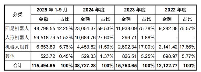 2025年前九个月,宇树科技来自人形机器人的收入达到5.95亿元,占总收入的51.53%。