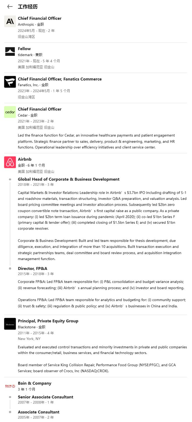 Krishna Rao在爱彼迎担任首席财务官期间积累了丰富的经验,这为他后来加盟Anthropic打下了坚实的基础。2015年,他从黑石集团转投优步和爱彼迎的竞争对手——爱彼迎,并迅速晋升至公司高层。