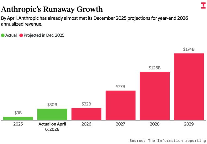 ▲2026年4月,公司年化收入已升至300亿美元,几乎提前实现此前对2026年底的预测目标(图源:The Information)
