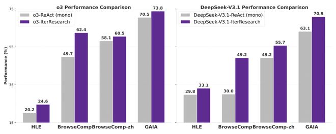 研究团队在 o3 和 DeepSeek-V3.1 上进行了测试。在完全相同任务设定下,与传统的 ReAct 方法相比,IterResearch 在最具挑战性的 BrowseComp 数据集上分别为 o3 提升了 12.7%,为 DeepSeek-V3.1 提升了 19.2%。