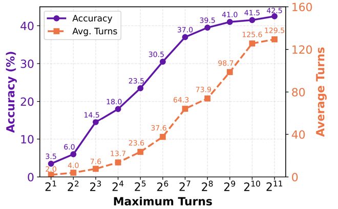 另一个有趣的发现是:尽管最大轮次设定为 2048,Agent 平均只用了约 80 轮就完成了任务。这表明 Agent 学会了在获取足够信息后主动终止搜索 —— 这说明它不仅学会了「走得远」还学会了「知道何时停」。