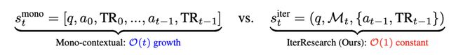 从上下文管理的角度看,传统 ReAct 的状态空间随交互轮次 t 线性增长(O (t)),而 IterResearch 的工作空间始终保持固定大小(O (1))。