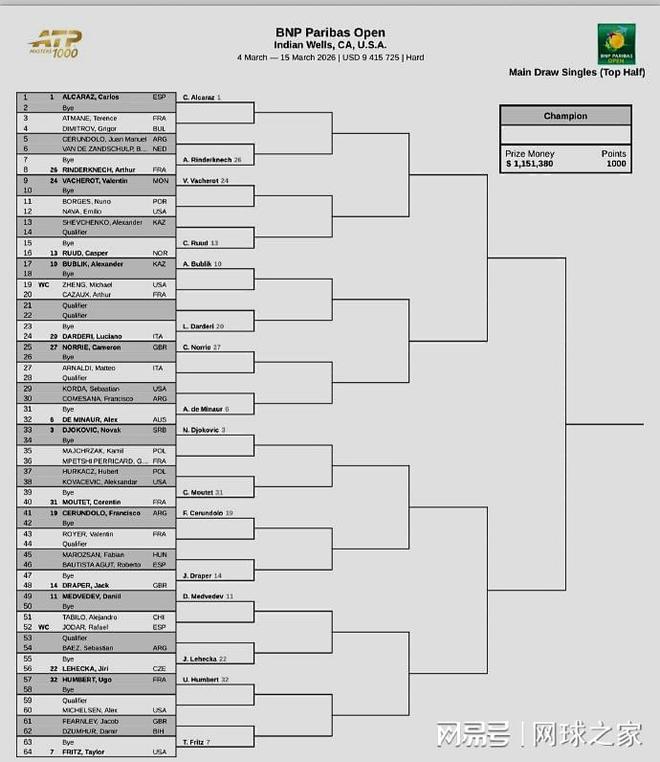 北京时间今日凌晨,ATP/WTA1000美国印第安维尔斯公开赛公布了单打正赛的抽签结果。男子项目中:世界前十选手均参赛,前八大种子的具体位置如下:上半区是阿尔卡拉斯对阵德米纳尔、德约科维奇迎战弗里茨;下半区则是穆塞蒂对战兹维列夫和谢尔顿挑战辛纳。遗憾的是没有中国球员进入正赛名单,不过有两名选手参加了资格赛,他们是香港的黄泽林与台湾的曾俊欣。