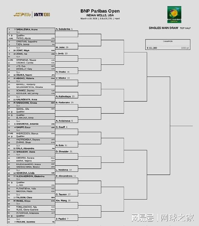女子项目方面:前八大种子的对阵情况如下,上半区是萨巴伦卡迎战阿尼西莫娃、高芙对鲍里妮;下半区则是佩古拉挑战莱巴金娜和米拉-安德列娃对抗斯瓦泰克。中国一姐郑钦文被列为24号种子,在首轮轮空后,第二轮将静候美国人布雷迪与克罗地亚人鲁季奇之间的胜者;若能晋级,则第三轮将面对捷克名将穆霍娃,第四轮则可能挑战世界第二、二号种子斯瓦泰克,签表相当具有挑战性。