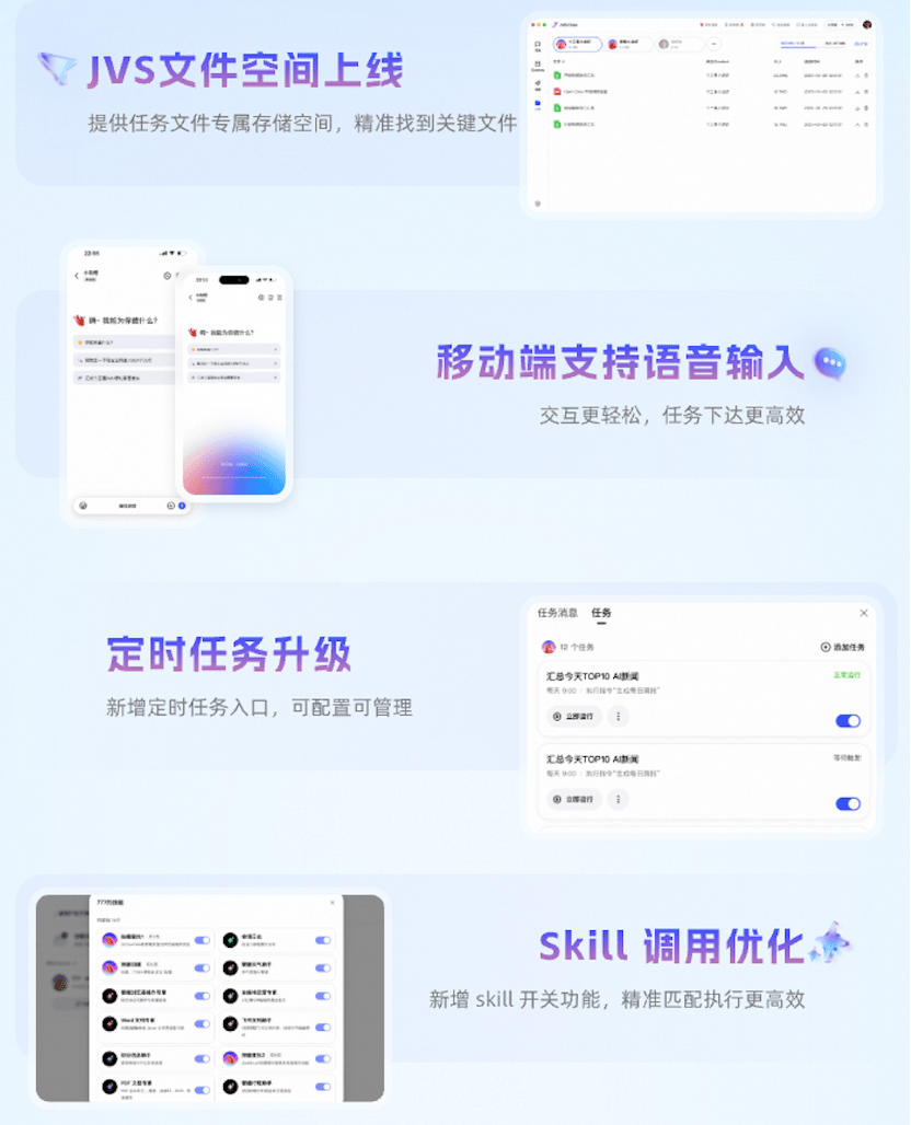新版本的JVS Claw带来了多项核心功能的改进,如移动端语音输入、JVS文件空间、技能调用优化、定时任务入口和Clawbot一键升级等。用户可以通过手机App直接输入语音,使任务下达更加高效;JVS文件空间则提供5GB的专属存储空间,方便用户在多轮对话中精准查找历史任务;新增的技能控制台支持用户自定义开关,提升了技能执行的安全性和效率。同时,《JVS养虾宝典》也提供了20多种高级使用场景,帮助用户快速获得所需结果。