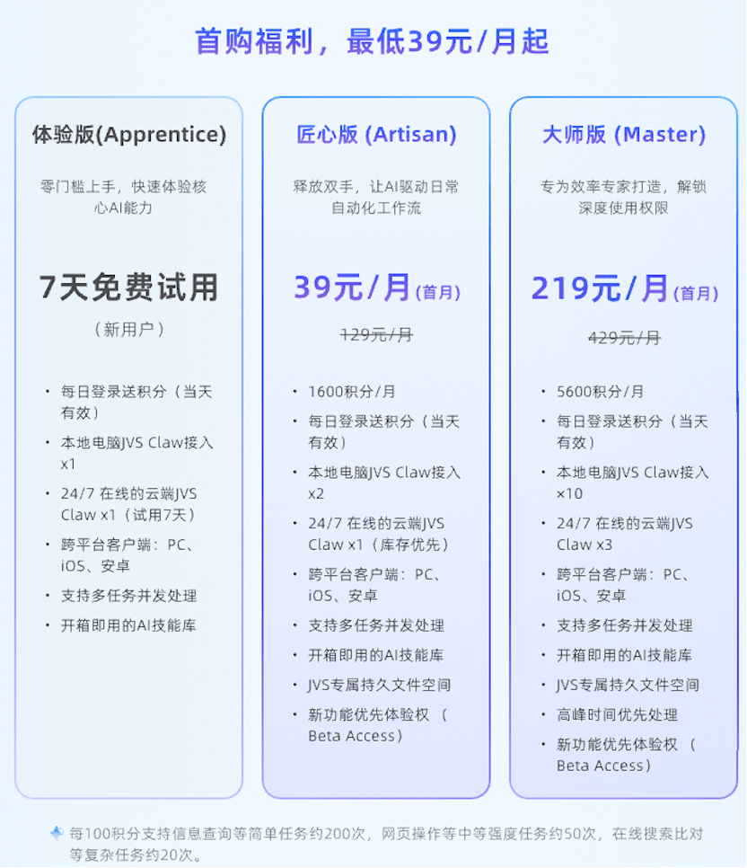 为吸引更多的中小团队和个人创作者,JVS Claw为新用户提供7天免费体验。同时,推出了“匠心版”和“大师版”两款套餐,分别提供39元和219元的首月优惠价格,解锁深度使用体验。匠心版每月包含1600积分和预装的技能库,适合日常自动化工作流;大师版则面向效率专家,每月包含3个云端Clawbot和5600积分,支持多任务并发处理和高峰优先权,助力构建复杂的商业自动化流程。