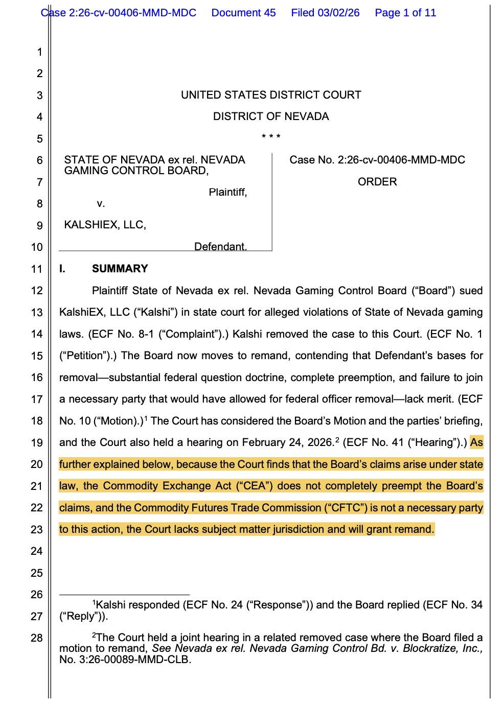周一发布的法院命令表明,两项美国联邦法庭的裁决增加了内华达州监管机构可能暂停该州预测市场交易的可能性。此前,法官在两份独立判决中将涉及Blockratize和Kalshi争议的案件交由州级法院处理。