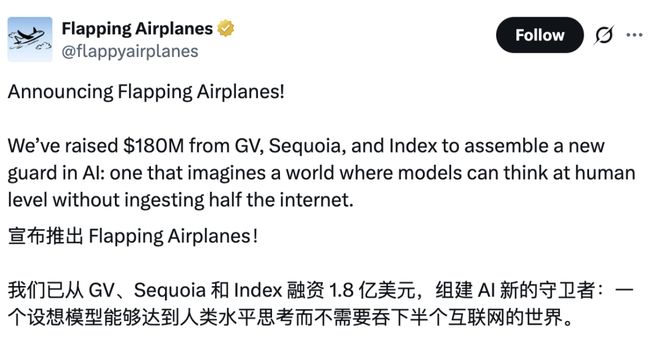 这家名叫Flapping Airplanes的新型实验室,刚拿了GV、红杉和Index Ventures的1.8亿美金种子轮。