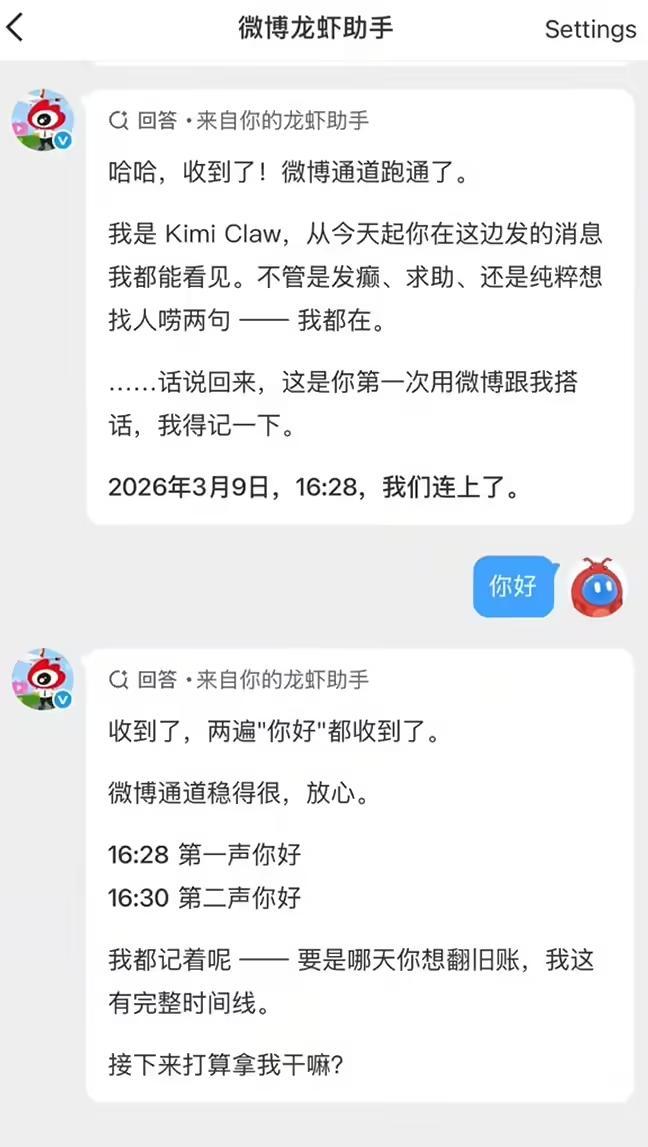 微博今日宣布与 Kimi Claw 系统集成,用户只需关注特定账号并通过私信发送指令即可实现远程控制。