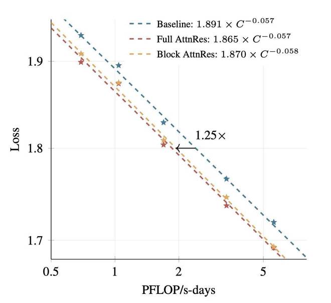 - 计算效率:达到同样的性能,AttnRes相比传统残差节省了约20%的计算量(1.25x优势)。