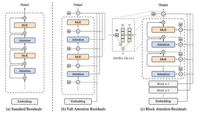 - 图1展示了Attention Residuals的概览:(a)标准残差:采用均匀加法累加的传统残差连接方式。(b)全量注意力残差:每一层都通过学习到的注意力权重,有选择地聚合之前所有层的输出。(c)块注意力残差:将各层划分为若干个「块」,将内存开销从O(Ld)降低至O(Nd)。
