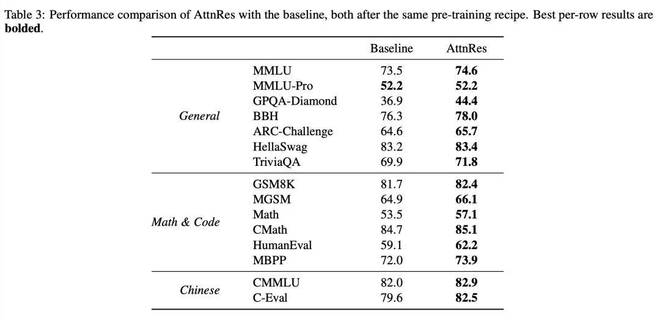 - 下游性能表现:如上表所示,Block AttnRes在所有评测任务中均达到或超过了基准模型。