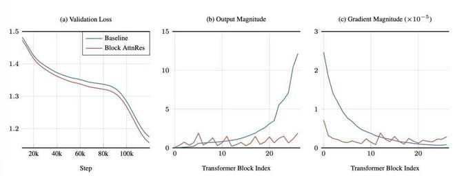 输出量级:基准模型遭受PreNorm稀释问题:随着隐状态量级随深度单调增长,深层网络被迫从固定缩放的归一化输入中学习越来越大的输出,以维持影响力。而Block AttnRes将这种增长限制在每个块内,通过块边界的选择性聚合重置了累加过程,呈现出有界的周期性模式。