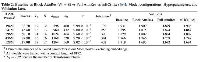 研究团队的最大模型基于Kimi Linear 48B配置:27个Transformer块(共54层),在256个路由专家中激活8个,外加1个共享专家,总参数48B,激活参数3B。该模型采用Block AttnRes,每块6层,共产生9个块外加1个Token嵌入,形成10个深度方向的来源。