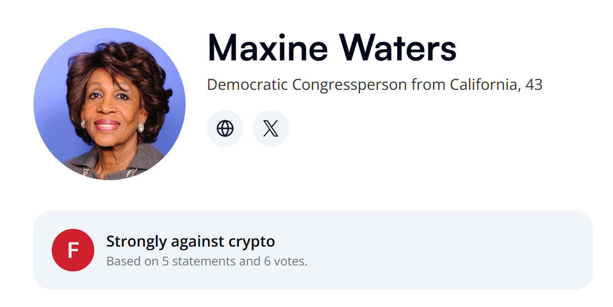 该团体将Waters列为“强烈反对加密”,因为她发表了五次反对加密立法的声明,并在六次投票中投了反对票,其中包括《数字资产市场透明法案》和《GENIUS法案》。