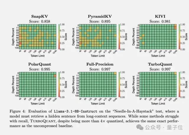 在“大海捞针”任务中,TurboQuant在所有测试中均获得了满分,内存占用减少了至少6倍。
