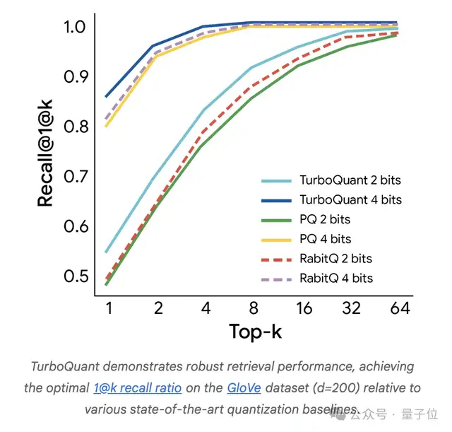 在向量搜索领域,TurboQuant同样超越了现有最优量化方法的召回率,而且不需要针对具体数据集做调优,也不依赖低效的大码本。