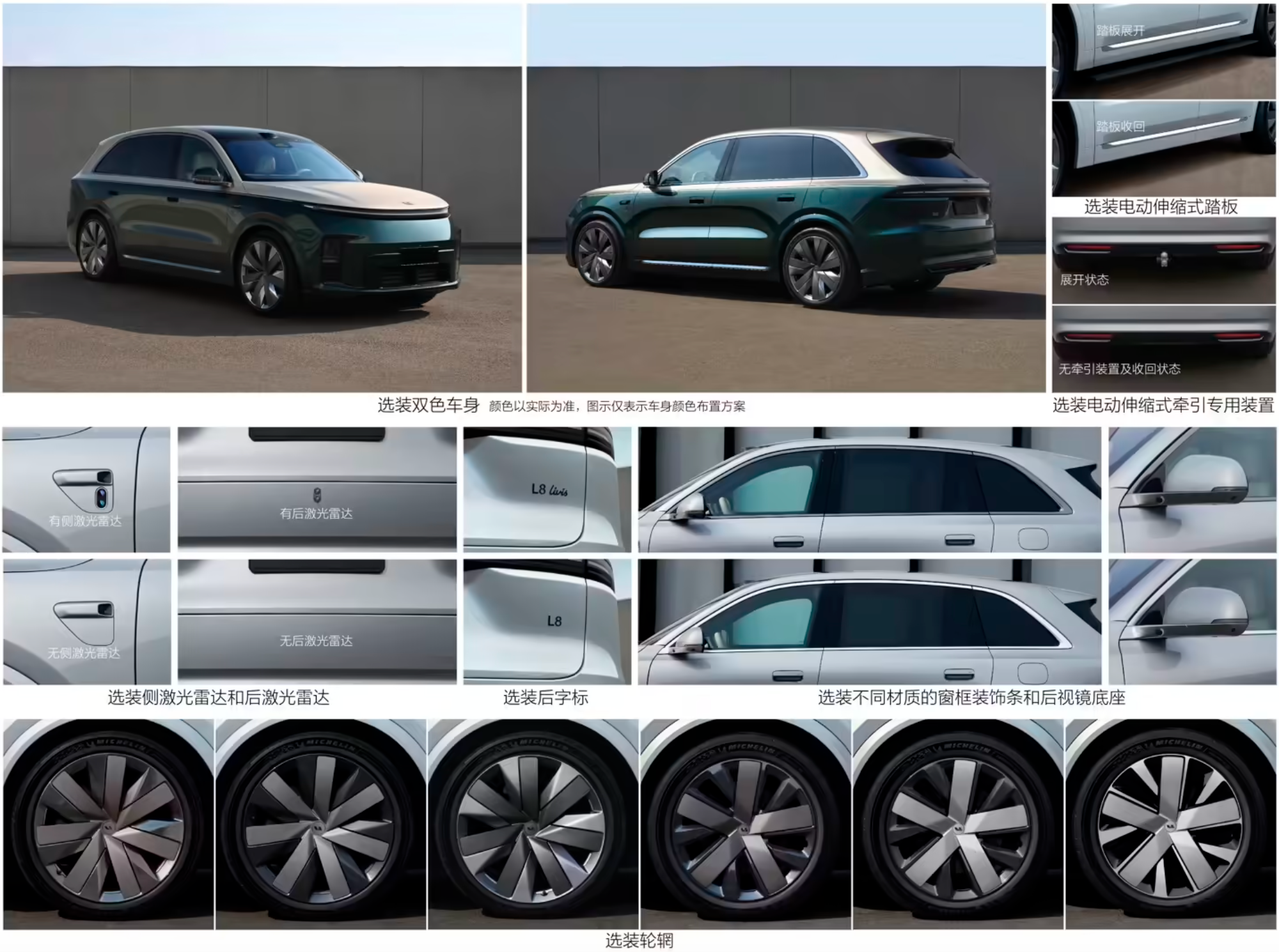 用户可以根据个人需求选择多种附加功能,包括不同样式的轮圈、电动伸缩踏板以及用于牵引的专用装置等。此外,还可以选装不同的窗框装饰条和后视镜底座材质,并且可以选择安装侧向或后向激光雷达及后方标志牌,同时提供双色车身选项。