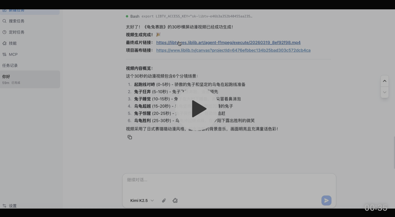 只要添加了LibTV Skill,大家的🦞就能秒变专业视频编导,主打一个一句话全自动出片。