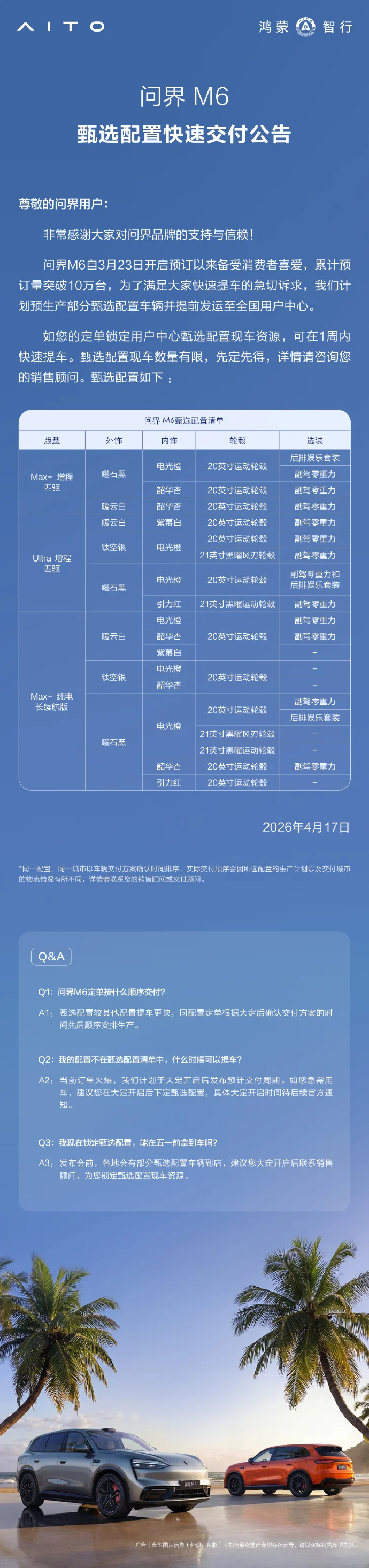 鸿蒙智行官方在4月17日宣布,问界M6预售订单已超过十万份。为了满足市场需求,现推出甄选现车,并将这些车辆提前发往全国各门店销售点,最快一周内即可提车。此次推出的甄选车型包括Max+增程四驱、Ultra增程四驱和Max+纯电长续航三种版本的多种配置。
