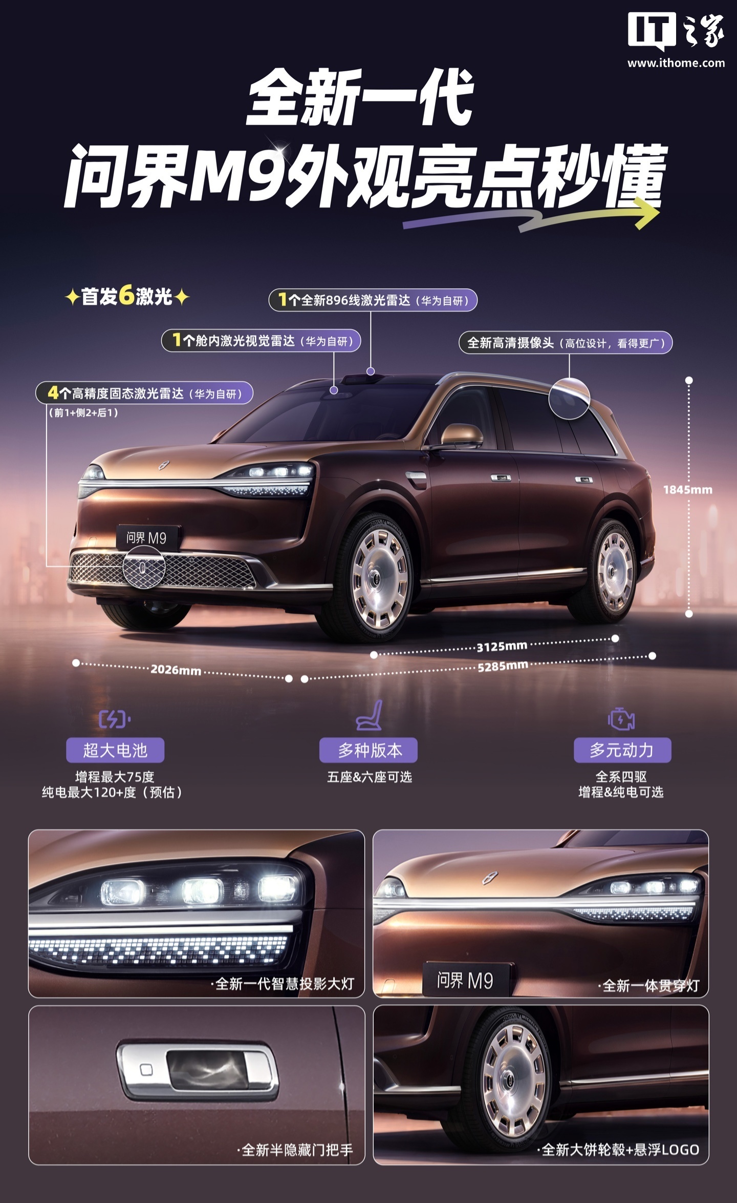 新车尺寸为长 5285mm、宽 2026mm、高 1845mm,轴距达到 3125mm。相比之下,现款问界 M9 的车身尺寸分别为长 5230mm、宽 1999mm 和高 1800mm,轴距为 3110mm,新款车型在整体大小方面略有提升。