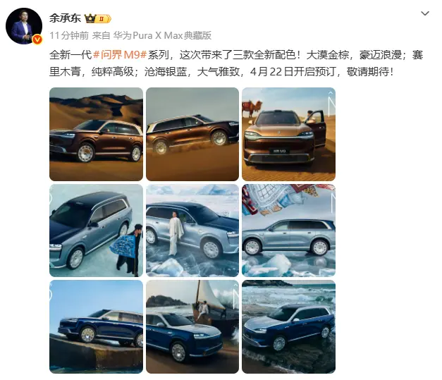 华为常务董事兼产品投资评审委员会主任、终端业务集团董事长余承东今日宣布了问界 M9 系列的三款全新配色,包括大漠金棕、赛里木青和沧海银蓝,并将于 4 月 22 日启动预订。