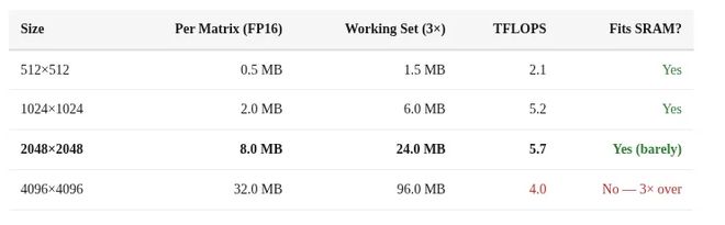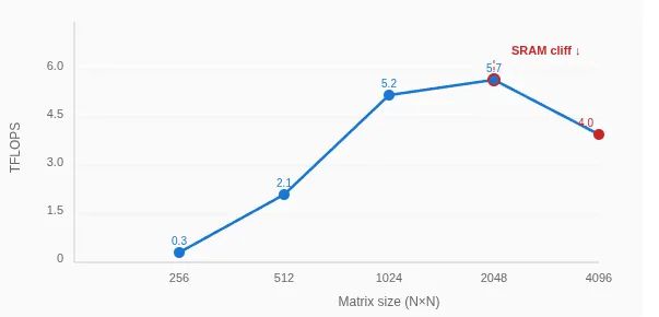 性能在4096尺寸时显著下降:从2048尺寸时的5.7 TFLOPS降至4096尺寸时的4.0 TFLOPS,这表明存在资源溢出问题。